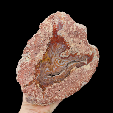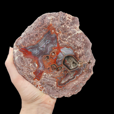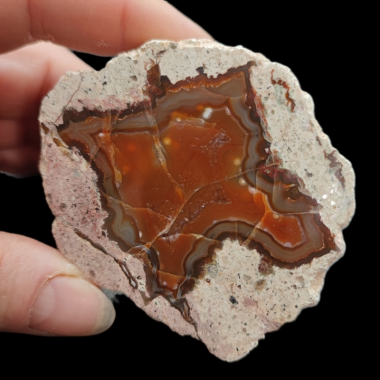 Okaz ma piękny czerwony wzór w kształcie 4-Rammiennej gwiazdy która w środku otwiera się i przekształca w geodę...
