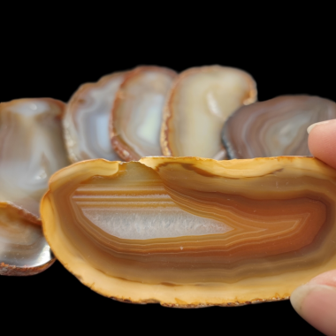 Przedmiotem oferty są bardzo ładne agaty pochodzące z Brazylii w formię ciętych płytek, dwustronnie szlifowanych.