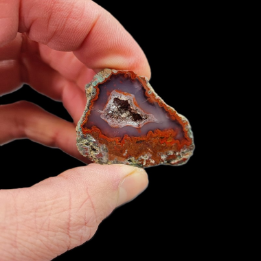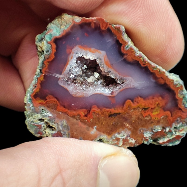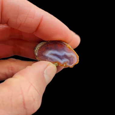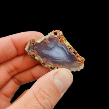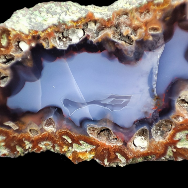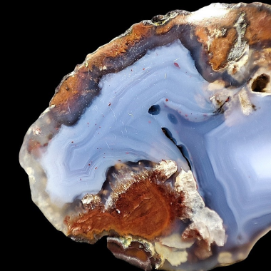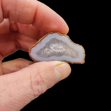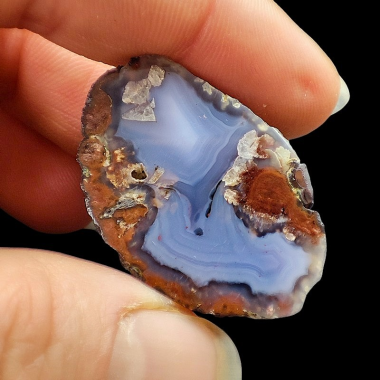 Agat charakteryzuje się błękitną obwódką z delikatnym wstęgowaniem na krawędziach. W środku ukazuje nam piękną krystalizację...