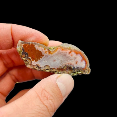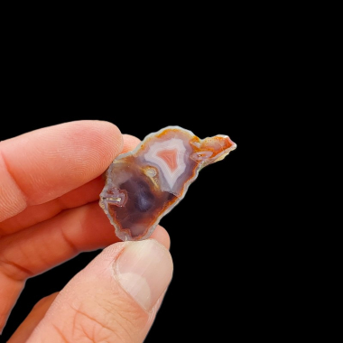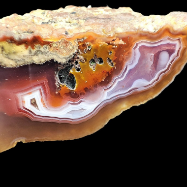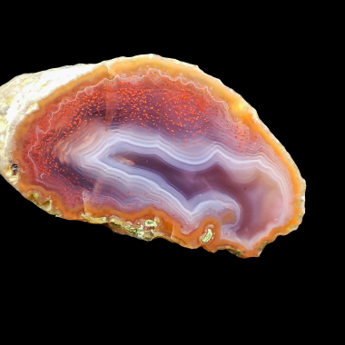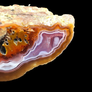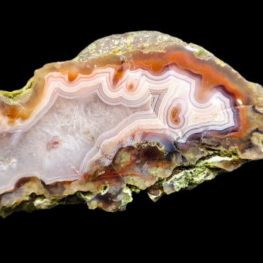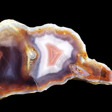 Bardzo interesujący agat z ciekawą - lekko różową kolorystyką wstęg, rozchodzących się po krawędziach agatu. W środku znajduje...