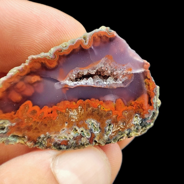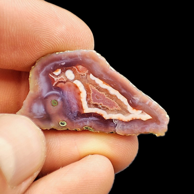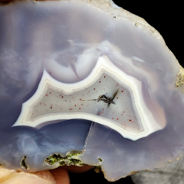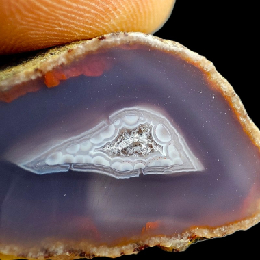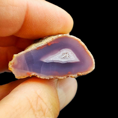 Bardzo ładny agaci z płóczek górncyh. Fioletowa powierzchnia z błękitnym wstęgowym wzorkiem. dodatkowo zabarwiony czerwonym kropeczkami i...