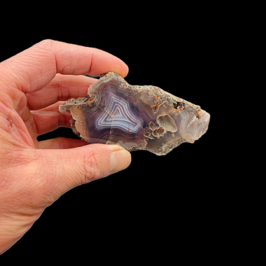 Charakterystyczna niebiesko- fioletowa barwa chacdedonu wypełni ten agat, a jego obraz tworzą koncentrycznie ułożone wstęgi w...