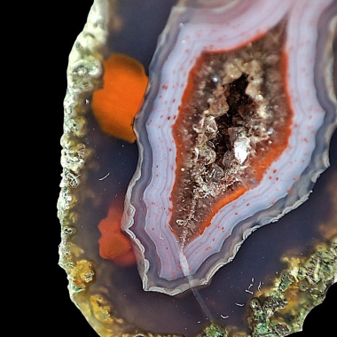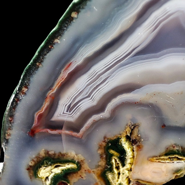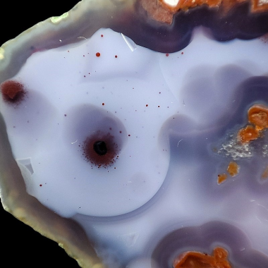 Piękny agat z pięknym wzorem, na którego powierzchni występują podatkowe czerwone kropeczki (prawdopodobnie inkluzje hematytu)...