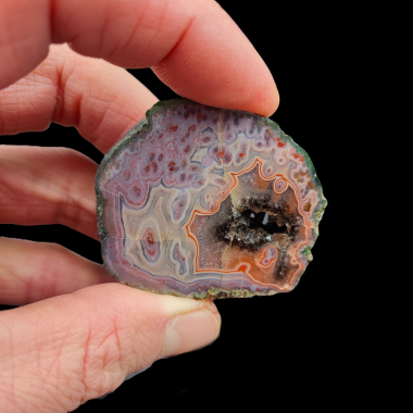 Piękny wzór tego agatu, który na końcu dodatkowo kończy się geodą z kryształkami górskimi. Intensywny fiolet, piękny...