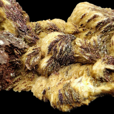 Niesamowity okaz barytu, pokryty na powierzchni drobniutkimi kryształkami, kolorowego chalkopirytu. Okaz pochodzący z polskich kopalni KGHM w okolicy Lubina. Skupienia...