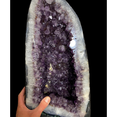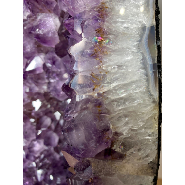 Wyjątkowa geoda ametystowa, idealna dla kolekcjonerów i osób ceniących naturalne dekoracje o unikatowym charakterze. Zewnętrzną część tworzy czysty kryształ górski z subtelną...