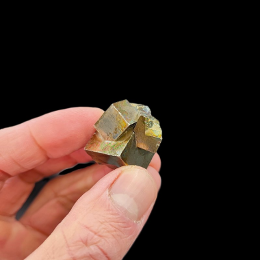 Piękny zrost 2 kostek pirytu. Z pierwszego bazowego kryształu wyrasta druga mała kosteczka pirytu. Okaz w bardzo dobrym stanie, posiada tylko 1 ślad od dołu po obecności zrostu...