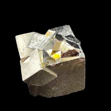Piękny zrost 2 kostek pirytu, wysokiej jakości. Z pierwszego bazowego kryształu wyrasta druga mała kosteczka pirytu. Okaz w bardzo dobrym stanie. Wszystkie ściany równe a rogi...