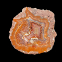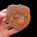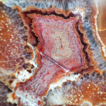 Wyjątkowy Agat pochodzący z okolic Nowego Kościoła. Charakteryzuje się politypową strukturą. Mamy tu zarówno wstęgi, krystalizację czystego kwarcu, bulwiasty chalcedon o pomarańczowym zabarwieniu, przyprószony białymi kuleczkami i kolejne wewnętrzne centrum na który pojawiają się różowe plami.
