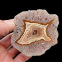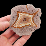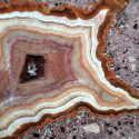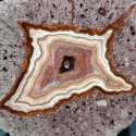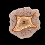 Szlifowany i polerowany minerał Agat pochodzący z okolic miejscowości Nowy Kościół na Dolnym Śląsku. Agat wyróżnia się pięknym rysunkiem, składającym się z kontrastowych wstęg w odcieniach bieli, czerwieni i pomarańczy, schodzących naprzemiennie do środka. Wstęgi są bardzo wyraźne, i efektownie ze sobą kontrastują, a całości dopełnia jeszcze czerwone oczko w środku agatu.
