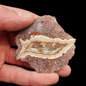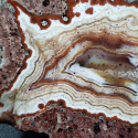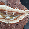 Szlifowany i polerowany minerał Agat pochodzący z okolic miejscowości Nowy Kościół na Dolnym Śląsku. Agat wyróżnia się pięknym rysunkiem, składającym się z kontrastowych wstęg w odcieniach bieli, czerwieni i pomarańczy, schodzących naprzemiennie do środka. Wstęgi są bardzo wyraźne, i efektownie ze sobą kontrastują, a całości dopełnia jeszcze czerwone oczko w środku agatu.