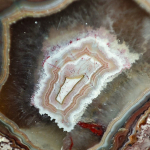 Szlifowany i polerowany minerał Agat pochodzący z okolic miejscowości Nowy Kościół na Dolnym Śląsku. Agat posiada wyjątkowy wzór o charakterystycznym kształcie i kolorystyce typowej dla agatów pochodzących z tej lokalizacji.