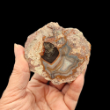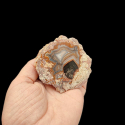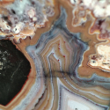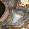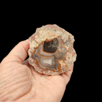 Szlifowany i polerowany minerał Agat pochodzący z okolic miejscowości Nowy Kościół na Dolnym Śląsku. Agat posiada wyjątkowy wzór o charakterystycznym kształcie i kolorystyce typowej dla agatów pochodzących z tej lokalizacji.