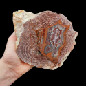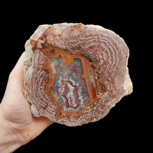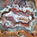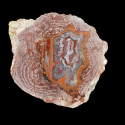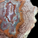 Szlifowany i polerowany minerał Agat pochodzący z okolic miejscowości Nowy Kościół na Dolnym Śląsku. Agat posiada wyjątkowy wzór o charakterystycznym kształcie i kolorystyce typowej dla agatów pochodzących z tej lokalizacji.
