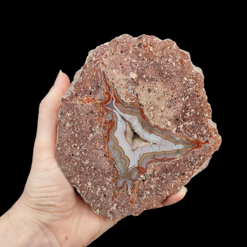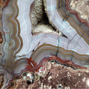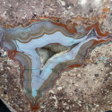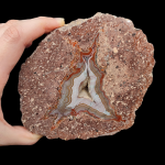 Szlifowany i polerowany minerał Agat pochodzący z okolic miejscowości Nowy Kościół na Dolnym Śląsku. Agat posiada wyjątkowy wzór o charakterystycznym kształcie i kolorystyce typowej dla agatów pochodzących z tej lokalizacji.