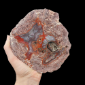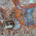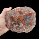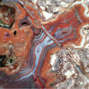 Szlifowany i polerowany minerał Agat pochodzący z okolic miejscowości Nowy Kościół na Dolnym Śląsku. Agat posiada wyjątkowy wzór o charakterystycznym kształcie i kolorystyce typowej dla agatów pochodzących z tej lokalizacji.
