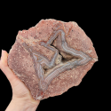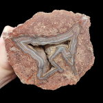 Szlifowany i polerowany minerał Agat pochodzący z okolic miejscowości Nowy Kościół na Dolnym Śląsku. Agat posiada bardzo oryginalne wnętrze. Od zewnątrz mamy bardzo oryginalny kształt rysunku, bardzo nietypowy jak na agaty z Nowego Kościoła. W środku znajduje się geoda, która nie jest wypełniona typowym krystalicznym kwarcem, tylko chalcedonem w formię wyschniętych - nachodzących na siebie warstw.