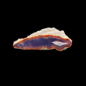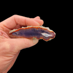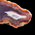 Wyjątkowo głęboki fiolet to baza tego agatu. Jego obraz zaczyna się od zewnętrznych krawędzi w formie naciekowej czerwonej barwy która idzie dookoła agatu. Następnie występuje w nim piękna ramka w formie czerwono białych wstęg idących dookoła agatu. A jego główny motyw znajduje się w prawym rogu, niczym źrenica w oku jakiegoś mistycznego smoka, który zamieszkiwał okoliczne wulkany Płóczek Górnych..... :)