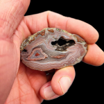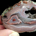 Agat posiada nietypową jak na Płoczki Górne czerwoną, co jest nie często spotykane w przypadku tej lokalizacji. Wzór agatu jest również fascynujący. Od zewnętrznych krawędzi mamy charakterystyczne wstęgi schodzące się ku środkowi. Następnie w środku agatu krystalizuje nam jakby podwójnie kryształ górski, ponieważ na powierzchni jednej krystalizacji pojawia się oczko z kolejnym wzorem i krystalizacją kryształu górskiego.