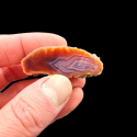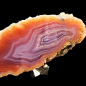 Niesamowita kolorystyka tego agatu przykuwa od razu oka pasjonata minerałów. W tym agacie dzieje sie naprawdę wiele. Mamy pomarancz, mamy czerwień, mamy oczywiście fiolet, błękit i biały akcent. A to wszystko w formie różnych wstęg, schodzących się do wnętrza agatu niczym do jego serca.