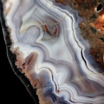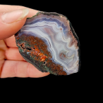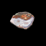 Charakterystyczny Agat płóczkowski o dużych rozmiarach. Bardzo ładny wzór - wstęgi narastają równomiernie po całej powierzchni agatu, schodząc się do jednego centrum . Dominacja barwy niebiesko--fioletowej, wstęgi w kolorze bieli z czerwonymi akcentami.