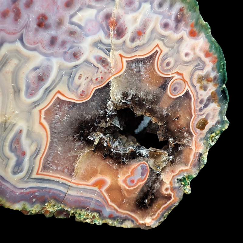 Wyjątkowy agat, aż ciężko sie na niego napatrzeć, zdecydowanie wyróżnia się na tle innych agatów z płóczek górnych. Niesamowita kolorystyka, kilka struktór wewnętrznych, wstęgi no i to co się dzieke w jego centrum. Czerwona wstęga odcinająca centrum agatu od jego zewnętrznych rubieży, niczym jądro komórkowe w którego wnętrzu zaczyna krystalizować kwarc, który na końcu się otwiera dając nam czarny kwarc dymny!