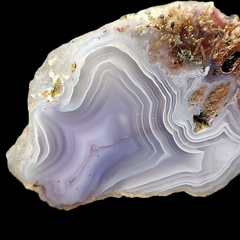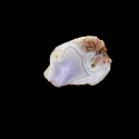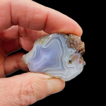 Ładny okaz o barwie błękitno-niebieskiej, z wyraźnym i charakterystycznym monocentrycznym wstęgowaniem się do środka kamienia. Na powierzchni widoczne dodatkowe malutkie czerwone kropeczki, co jest częstym zjawiskiem w płóczkowskich agatach.