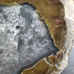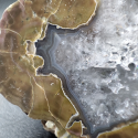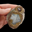 Charakterystyczny Agat dla lokalizacji w stanie Oregon nazywany Thundereggs od mistycznego ptaka THUNDERBIRD. Jeżeli interesuje skąd wziewa się ta nazwa to zajrzyj do opisu poniżej :) Agat charakteryzuje się brązowo-szarą obwódką, a jego środek wypełniony jest szarawo-niebieski chalcedonem, który miejscami krystalizuje do czystego kryształu górskiego. Agaty ze stanu Oregon nie należą do wyszukanych kolorystycznie agatów z bujnymi wzorami, ale to za sprawką właśnie swojej unikalności są gorącym kąskiem wśród kolekcjonerów Agatów na całym świecie, no i któż by nie chciał mieć w swojej kolekcji jaja Ptaka Piorunowego :) POCHODZENIE: USA - Oregon Wymiary: 7 x 5 cm Waga: 134g Kamień 100% NATURALNY, JEDNOSTRONNIE SZLIFOWANY, NIEBARWIONY Znaków zodiaku: Bliźnięta, Panna