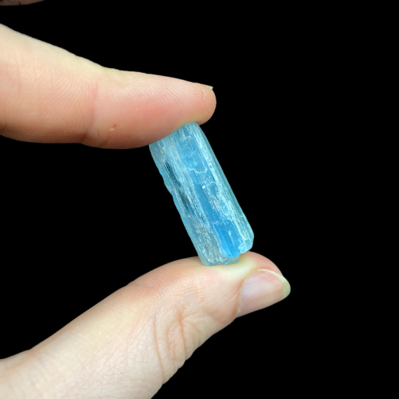 Prezentowany okaz charakteryzuje się słupkowym kształtem o jasnoniebieskiej-błękitnej barwę, niczym poranne niebo.