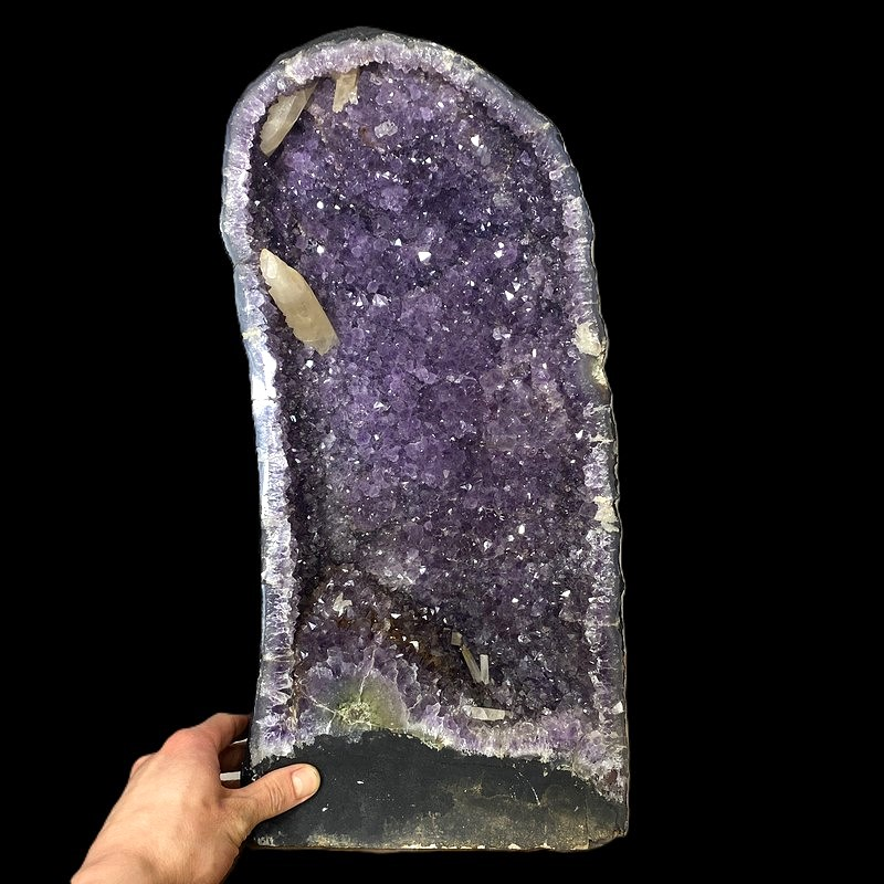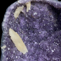 Witam serdecznie, Do sprzedania mam bardzo ładną dużą geodę ametystową o wadze 25kg, przepełnioną idealnymi fioletowymi kryształami na jej całej odsłoniętej powierzchni. Dodatkową geoda wyróżnia się pięknymi kryształami kalcytu. W spodzie geody mamy jedno skupisko idealnie wykształconych kryształów kalcytu w formie szpiców z ładnym czubkiem. Natomiast w górnej części znajdują się dwa na prawdę duże pojedyncze kryształy kalcytu. Obecność kalcytu w geodach ametystowych zawsze podnosi ich wartość i nadają wyjątkowego charakteru. Wymiary Okazu: Waga: 25kg Wysokość: 48cm Szerokość: 23cm Głębokość: 18cm POCHODZENIE: URUGWAJ Ametyst polecany jest dla Znaków zodiaku: Baran, Koziorożec