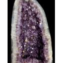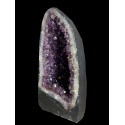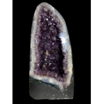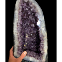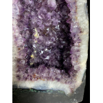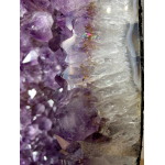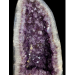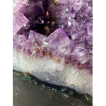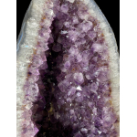 Wyjątkowa geoda ametystowa, idealna dla kolekcjonerów i osób ceniących naturalne dekoracje o unikatowym charakterze. Zewnętrzną część tworzy czysty kryształ górski z subtelną iryzacją, która nadaje mu delikatne, tęczowe refleksy. W strefie przejścia w ametyst pojawiają się rzadkie wrostki rutylu, znane jako „Włosy Wenus”, w złoto-bursztynowym kolorze – element szczególnie poszukiwany przez kolekcjonerów. Wnętrze geody wypełniają wysokiej jakości kryształy ametystu o głębokim fiolecie, dużej przejrzystości i mocnym połysku. Całość tworzy harmonijną kompozycję minerałów, która pięknie prezentuje się w każdej ekspozycji. Idealny okaz do kolekcji i do wnętrz pełnych naturalnego piękna.
