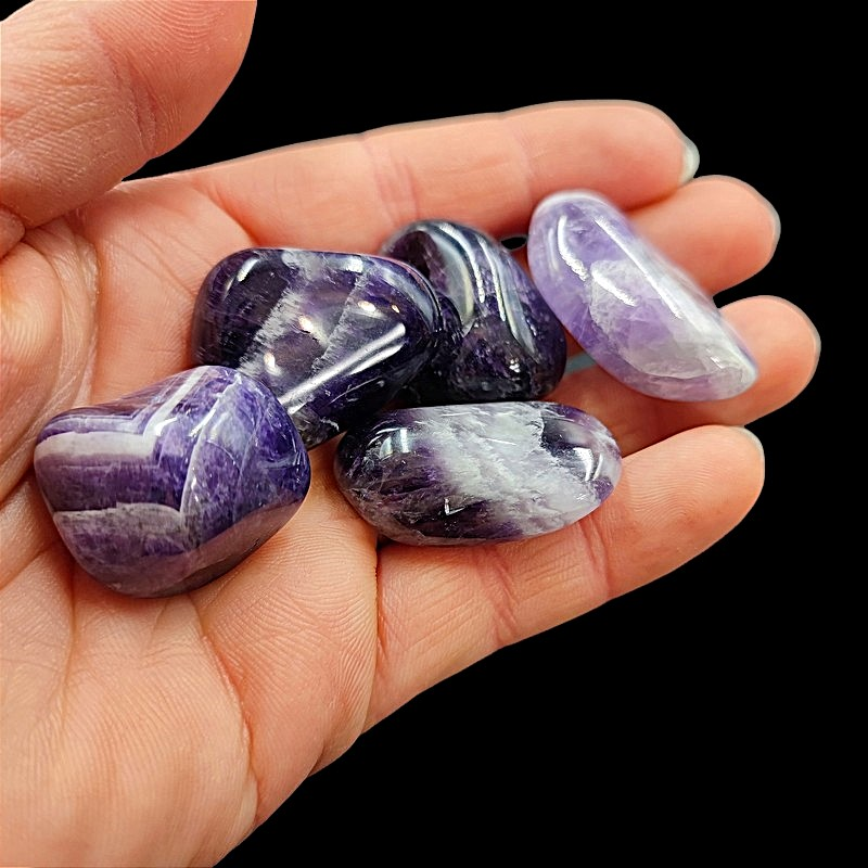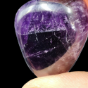 Ametys Chevron - To wyjątkowa odmiana Ametsytu, która charakteryzuje się naprzemienną kolorystyką fioletowych, jasno-fioletowych i białych barw. Które często układają się w naprzemiennych warstwach. Przedmiotem oferty jest 1 sztuka wypolerowanego ametystu tzw. otoczaka. Struktura barw jest zróżnicowana ii w każdym kamieniu może wyglądać inaczej.