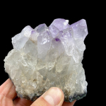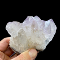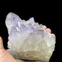 Przedstawiam szczotka kwarcu z dużymi kryształami górskimi, które na swoich szczytach zmieniają się w delikatny fioletowy ametyst. Szpice kryształów bardzo ładnie ukształtowane, w szczególności 1 duży, który wybija się z powierzchni pozostałych kryształów na szczycie okazu. Również efektowny jest obok niego boczny zrost 3 kryształów ametystu. Kryształ stabilnie stoi, dzięki czemu bardzo ładnie się prezentuje, zarówno jako dekoracja czy okaz w kolekcji minerałów. WYMIARY: Wysokość 8 cm Szerokość: 10 cm Grubość: 8 cm Waga: 600 gram POCHODZENIE: BRAZYLIA Kamień 100% NATURALNY Znaków zodiaku: Bliźnięta, Lew
