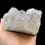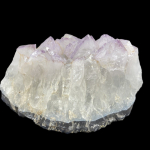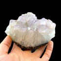 Duża, masywna szczotka Kryształów Górskich ważąca niemal 1 kg. Kryształy Górskie wyrastają z podłoża chalcedonowego, aby następnie na czubkach dużych i transparentnych szpiców kryształów przemienić się w delikatnie zabarwiony ametyst w odcieniu fioletowo - różowym. Cała szczotka kryształów przypomina mi nieco, duży masy górski z wieloma szczytami.   Kryształ stabilnie stoi, dzięki czemu bardzo ładnie się prezentuje, zarówno jako dekoracja czy okaz w kolekcji minerałów. WYMIARY: Wysokość 8 cm Szerokość: 13 cm Grubość: 7 cm Waga: 965 gram POCHODZENIE: BRAZYLIA Kamień 100% NATURALNY Znaków zodiaku: Bliźnięta, Lew