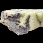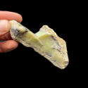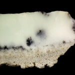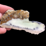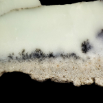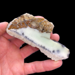 Bardzo interesująca okaz mineralny, ponieważ w głównej mierze mamy tu opal mleczny, który w kilku miejscach został zabarwiony wrostkami minerałów niklonośnymi na delikatny mietowo-zielony odcień. Stąd możemy przyjąć nazwę tego okazu wg. typologi zaprezentowanej prze prof. M. Sachanbińskiego jako opal prazowym, lub też chryzopraz fantazyjny.