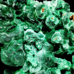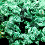 Bardzo ciekawy okaz malachitu, ponieważ mamy widoczne na nim zarówno skupienia minerałów bulwiaste (w dominującej ilości) jak i skupienia włókniste.