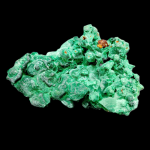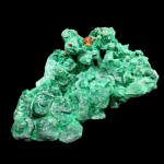 Wyjątkowy okaz naturalnego, surowego malachitu. Malachit posiada bardzo ciekawie skupienia minerałów w formie groniastej - kuliste, przypominające bulwy rozmieszczone po całej powierzchni. Niektóre bulwy odsłaniają w sobie, drobniuteńkie włókniste kryształki, skupione na całej powierzchni bulwy.