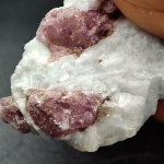 Różowa Odmiana Turmalinu zwana Rubeli. Okaz osadzony jest w skala macierzystej, którą jest kwarc mleczny. Charakteryzuje się ułożeniem 3 słupkowych kryształami zatopionymi w kwarcu. Dwa kryształy w całości widoczne po jednej stronie, a po przeciwnej stronie mamy widoczne fragmenty tych kryształów. Przybliżone wymiary: Wymiary: 3 x 3 x 1,5 cm Waga 15g. POCHODZENIE: BRAZYLIA Kamień 100% NATURALNY Polecany dla Znaków Zodiaku: Koziorożec, Waga